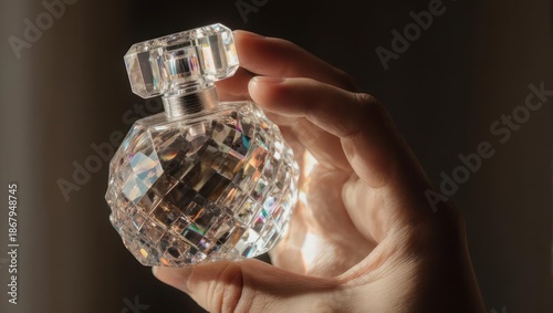 Hand holding a beautiful faceted glass perfume bottle with colorful reflections.