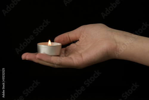 Hand holding a candle on black background