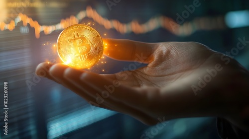 hand, holding, glowing, coin, fluctuating, stock, market, graph, number, background