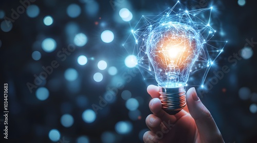 hand, light, bulb, glowing, bright, network, line, connected, idea, innovation, creativity, solution, cognition, inspiration, technology, future, digital, abstract, concept, design, background, blue, dark, blur, bokeh, sharpened, modern, pattern, shape, energy, power, electricity, connection, graphic, illustration