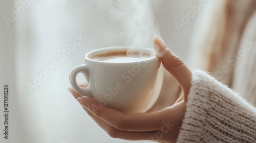 hand, holding, hot, hot drink, cup, steam, rising, white, background, soft, natural, lighting