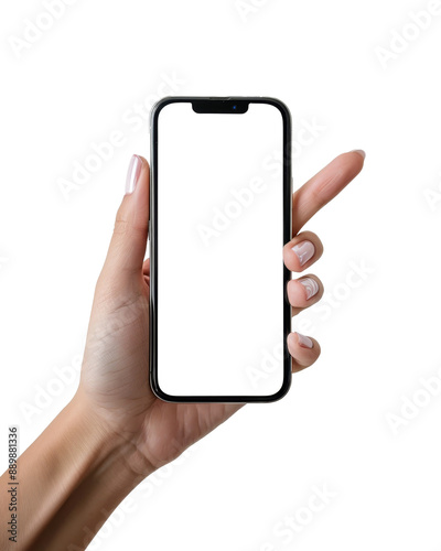 Hand holding a mobile phone with white blank display screen. Mock up template with transparent background