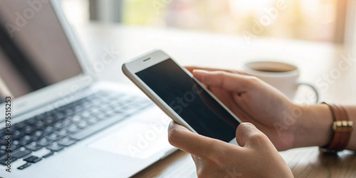 Hand holding a smartphone beside a laptop in a workspace with the concept of online communication