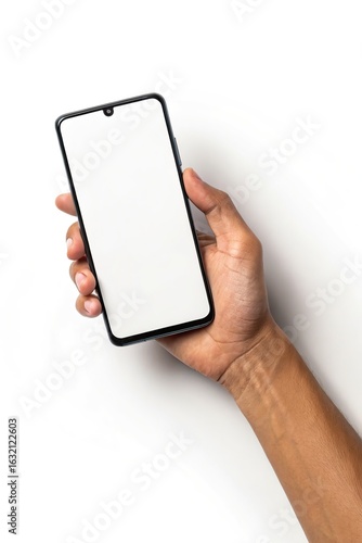 hand, holding, smartphone, phone, mobile, device, screen, blank screen, technology, communication, digital, wireless, touch screen, contraption, person, human, finger, thumb, isolated, background, white background, minimalist, modern, user, app, cyberspace, online, connectivity, display