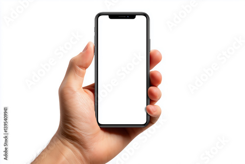 Hand holding a smartphone with a blank screen isolated on a white background for creative design purposes