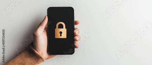 Hand holding a smartphone with a glowing yellow lock icon, set against a bright white minimalist background, highlighting personal security and technological reliability