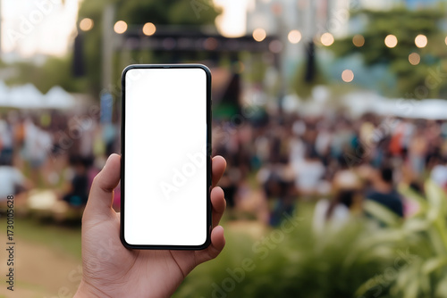 Hand holding a smartphone with blank screen at an outdoor event, festival or concert, perfect for mobile app or website promotion.