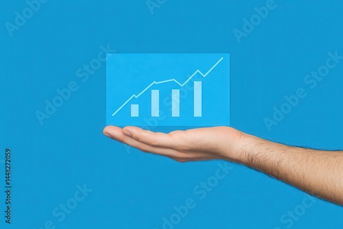 Hand holding a transparent graph chart showing an upward trend against a blue background