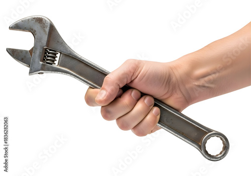 Hand holding an adjustable wrench isolated on transparent background
