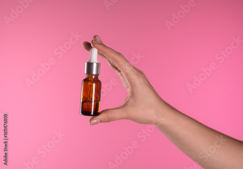 Hand Holding Dropper Bottle Against Vibrant Pink Background