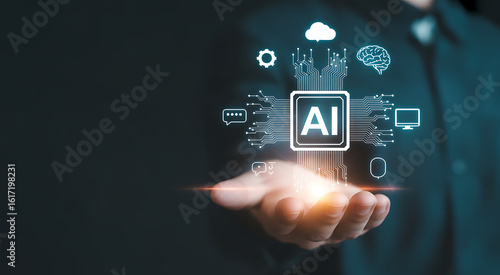 ai, artificial intelligence, technology, digital, futuristic, innovation, network, datum, cloud, brain, computer, gear, chat, communication, connection, information, circuit board, digital illustration, glowing, light, hand, human hand, palm, abstract, digital artwork