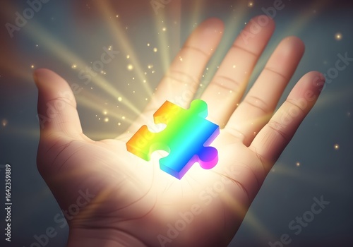 Hand holding glowing rainbow puzzle piece autism ADHD neurodiversity awareness hope concept