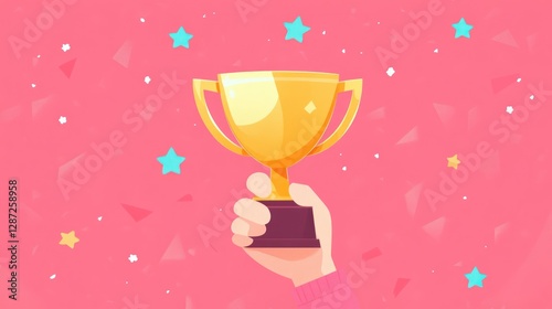Hand holding gold trophy, confetti background, victory celebration, award