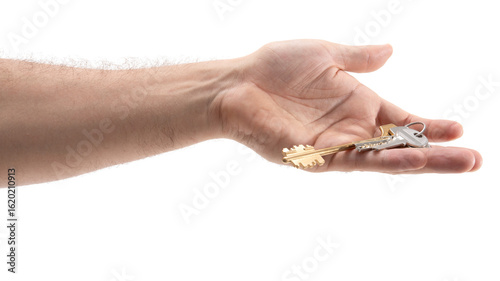 hand, key, access, opportunity, metal, detail, light, gesture, holding, palm, closeup, white background, simplicity, sharpened, home, security, unlocking, property, transition, movement, tactile, personal, belonging, modern, lifestyle, minimalism, texture, interaction, ownership, responsibility