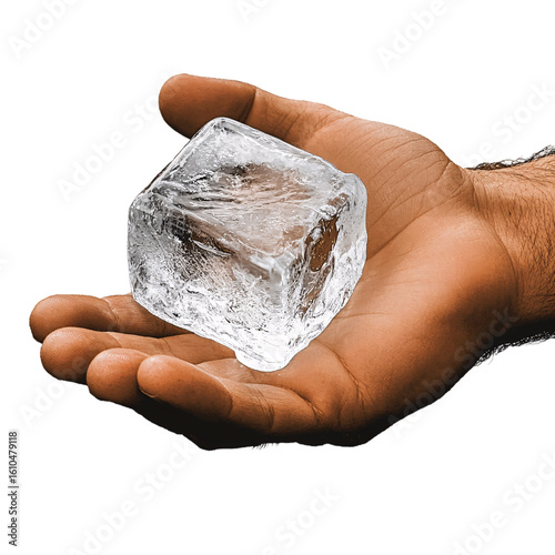 Hand holding large clear ice cube; dark background; cool, refreshing mood; high-resolution image.