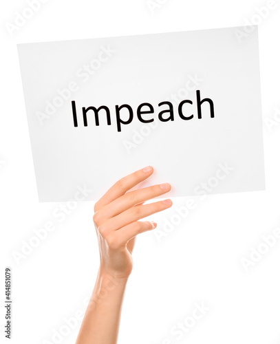 Hand holding paper with text IMPEACH on white background