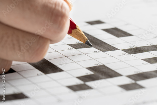 hand holding red pencil, try to write an answer on crossword puzzle. Black and white crossword puzzle. On black background.