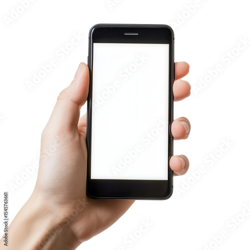 Hand holding smartphone blank screen mobile phone technology device isolated on a transparent background