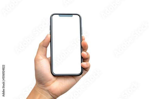 Hand holding smartphone with blank screen isolated on a white background png ai generated