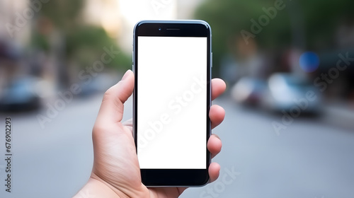 Hand Holding Smartphone with Blank Screen on City Street Background