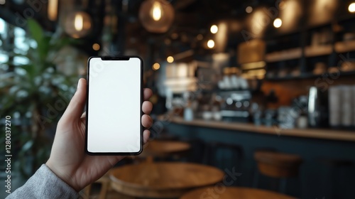 hand holding smartphone with blank white screen. Blurred coffe shop background