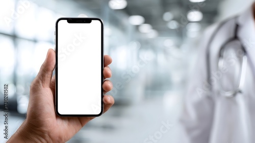 Hand holding smartphone with blank white screen in medical facility with blurred doctor background