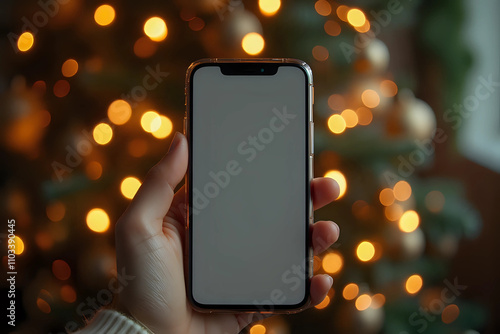 Hand holding smartphone with empty screen against stylish festive christmas tree with golden lights.Christmas phone mock up. Space for text. Christmas advertising, smartphone app template