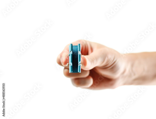 Hand holding stationery metal colored clips. Close up. Isolated on white background.