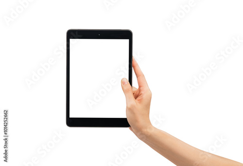 Hand holding the black digital tablet with mockup of blank screen on isolated white background.