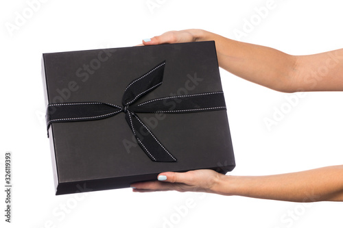 hand holds beautiful gift box with bow isolated on white background