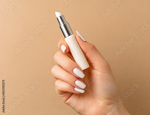 hand, holding, cosmetic, tube, white, nail, manicure, fingernail, beauty, cream, product, skincare, beige, background, elegant, female, woman, style, clean, minimalist, fashion, personal, care, health, healthy, smooth, skin, neutral, container, metal, cap, dispenser, applying, treatment, wellness, human, hygiene, detail, fingernail, polish, enamel, shiny, glamour, refined, well-groomed