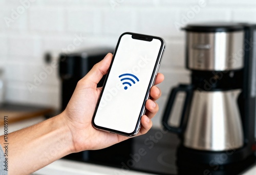 wi-fi, connectivity, smartphone, mobile phone, wireless, technology, cyberspace, digital, coffeemaker, hand, screen, network, automation, device, signal, electronic, communication, remote control, setup, pairing, control, household, modern, brew, kitchen, countertop, display, contraption, system, connection, home automation, service, application, kitchen utensile, tile, background, user