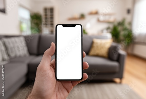 hand, phone, smartphone, screen, white, blank, living, room, modern, interior, background, blurred, grey, couch, pillow, furniture, display, device, technology, communication, mobile, digital, human, holding, person, home, domestic, lifestyle, nobody, indoor, contemporary, design, minimal, simplicity, clean, uncluttered, template, presentation, space, sharpened, foreground, perspective, view, electronic, portable, rectangular, object, casual attire
