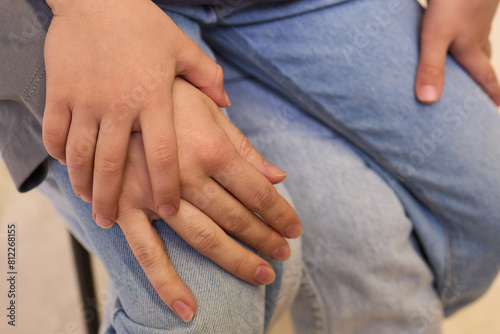 Hand in blue denim sleeve holding child hand