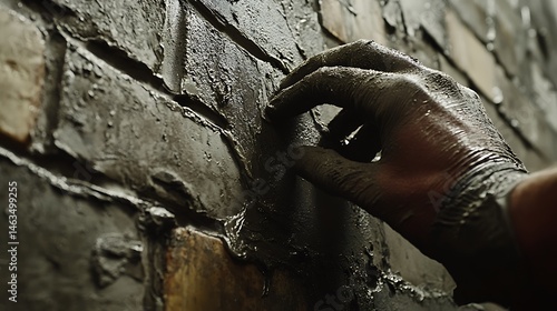 Hand in Glove Applying Mortar to Brick Wall