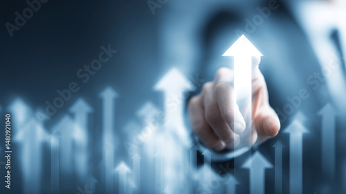 Hand interacting with glowing upward arrows, symbolizing growth, progress, and success in business strategy