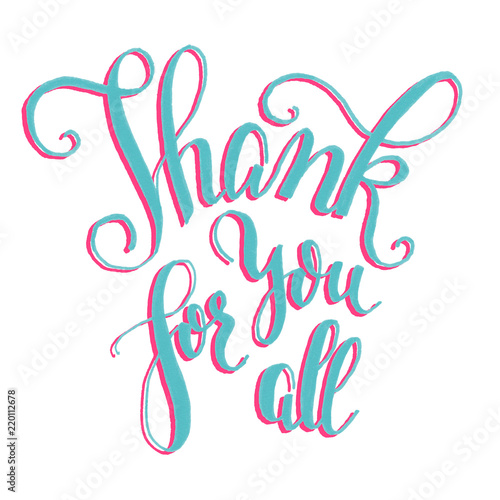 Hand lettering "thank you for all". Blue-pink drawn art text on white background.