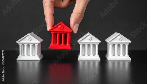 hand, building, model, structure, classical, column, pediment, architecture, bank, government, institution, white, red, contrast, difference, selection, choice, decision, highlight, sharpened, distinct, unique, variation, comparison, arrangement, row, order, mirror, surface, black, background, display, concept, symbol, idea, judgement, priority, emphasis, distinction, organisation, visual, design
