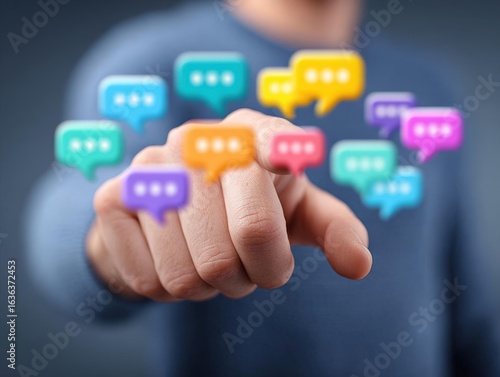 Hand lifts, a spectrum of chat bubbles flutter across a dynamic screen