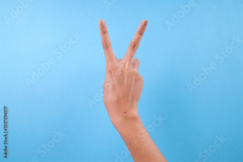 hand, finger, gesture, isolated, arm, signs, symbol, showing, peace, victory, blue, background, 2, finger, up, number, v, deuce, made, human, extended, 1, single, body, part, skin, studio, shot, simple, plain, bright, light, colours, concept, graphic, design, artistic, closeup, minimal, positive, agreements, success, celebration, gesticulate, communication, expression, index, middle, number two
