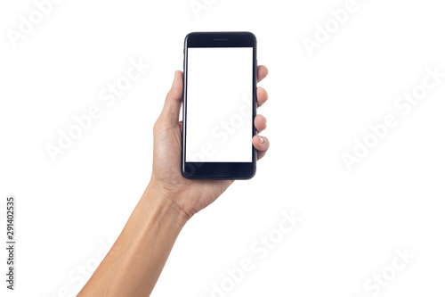 Hand man holding smartphone with blank screen isolated on white background with clipping path