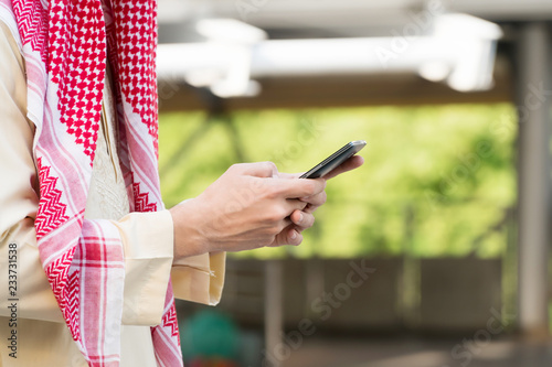 Hand of Arab Middle Eastern young businessman using smartphones. Technology concept.