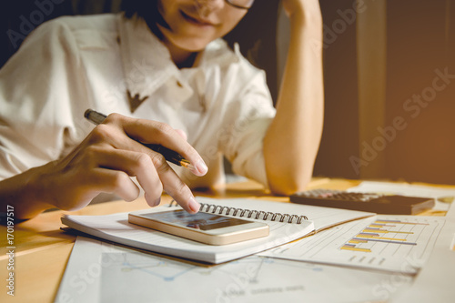 Hand of business woman holding a pen and touching screen of smart phone for searching business data.There is calculator beside her. Shallow depth of field. Focus at finger tip.