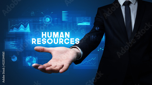 Hand of Businessman holding HUMAN RESOURCES inscription, business success concept