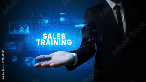 Hand of Businessman holding SALES TRAINING inscription, business success concept