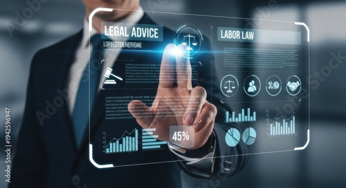hand, of, businessman, touching, legal, advice, and, labor, law, interface, on, virtual, business, screen