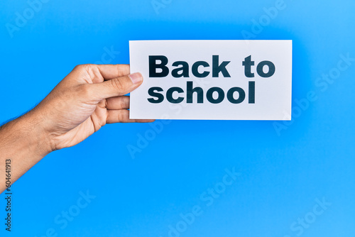 Hand of caucasian man holding paper with back to school message over isolated white background