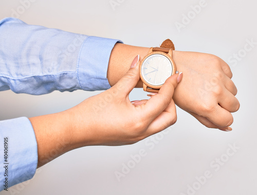 Hand of caucasian young businesswoman wearing wristwatch. Catching watch with two fingers over isolated white background