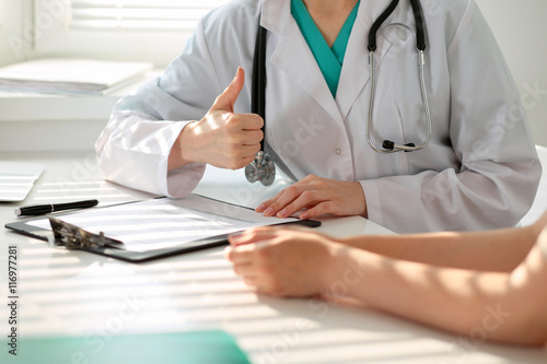 Hand of doctor reassuring her female patient and showing ok sign. Medical ethics and trust concept