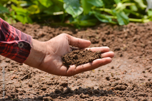 Hand of farmer checking soil health before growth a seed of vegetable or plant seedling. Agriculture concept.